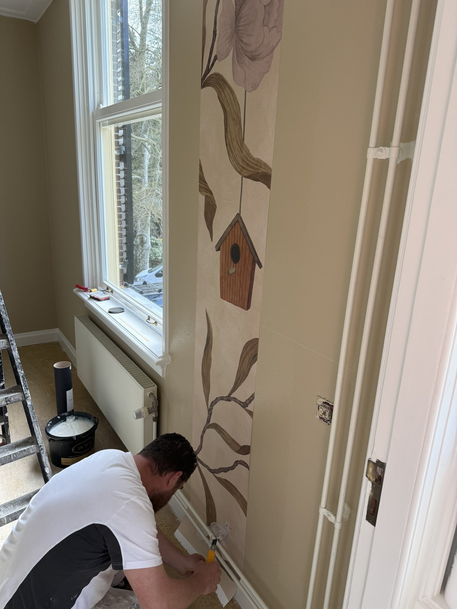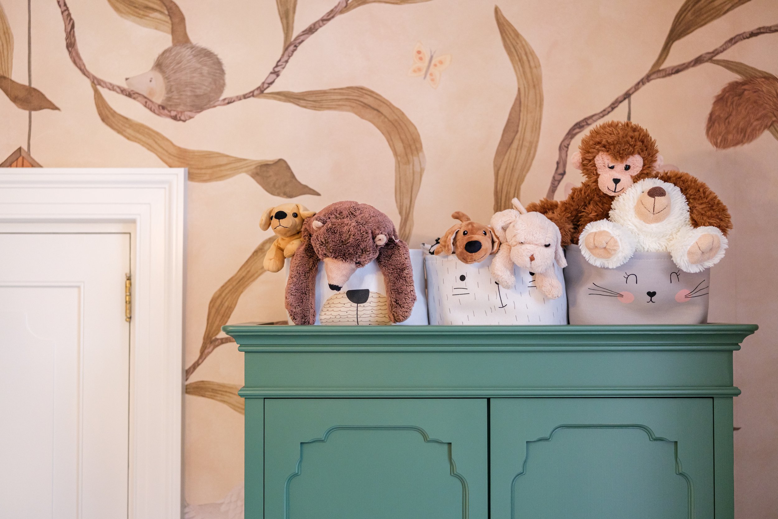 Deze kamer met badkamer krijgt een volledig nieuwe look. Alle wanden waren bordeauxrood. Dit wordt vervangen door een weeldering behang rondom. De verwarming wordt in dezelfde basiskleur van het behang meegenomen, waardoor deze bijna niet opvalt. Op de vloer komt een zachte vloerbedekking, heerlijk om op te spelen.