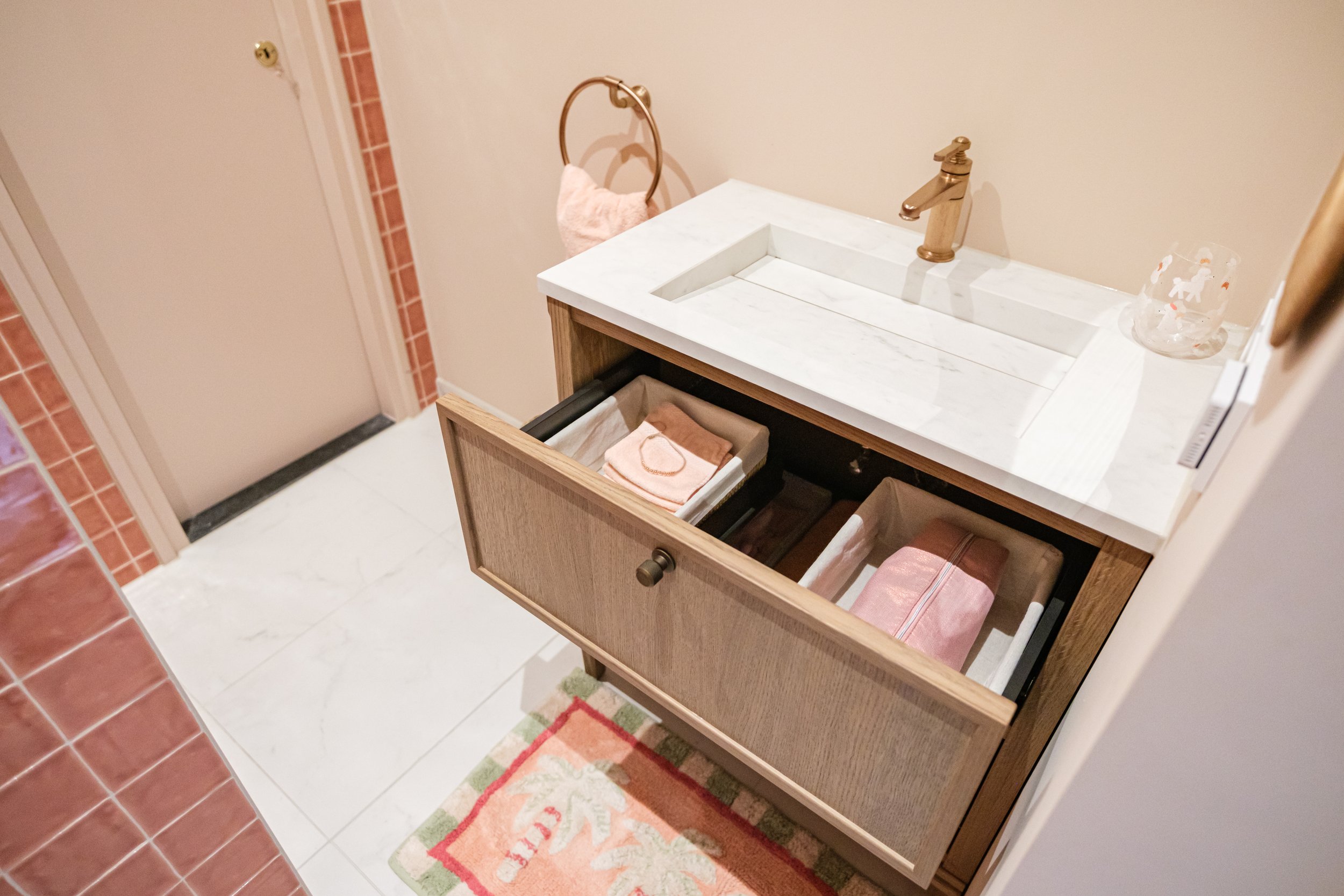 De badkamer krijgt een compleet nieuwe look en wordt voorzien van vloerverwarming. De vloer is uitgevoerd in marmerlook tegels, terwijl de wanden zijn bekleed met zalmkleurige tegeltjes. Het badmeubel is door mij zelf ontworpen en in detail uitgewerkt samen met de meubelmaker. De kranen sluiten naadloos aan bij het ontwerp en passen perfect bij de stijl van de woning.