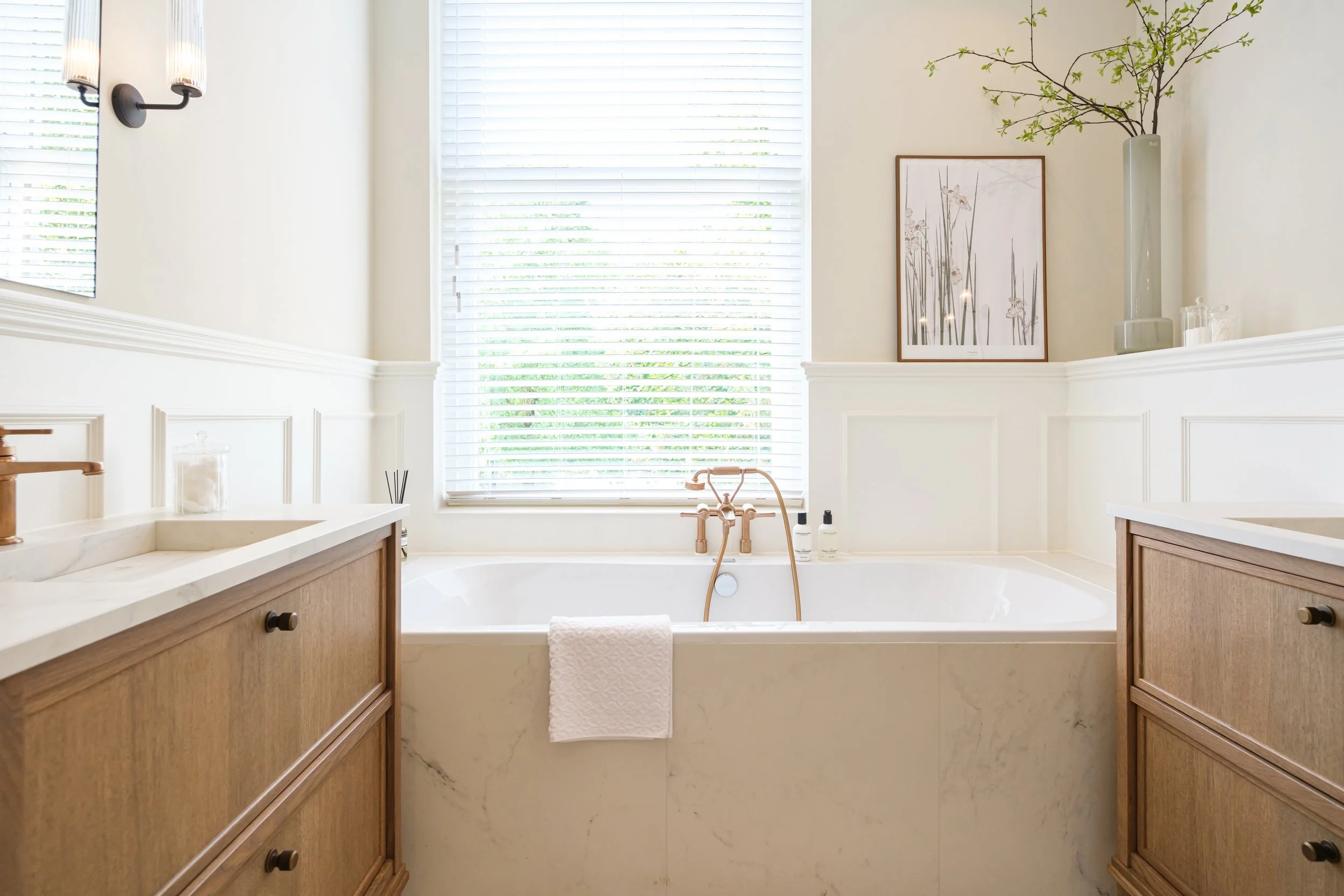 Om de ruimte meer diepte te geven, is de deur naar het opberghokje verwijderd en en de vloertegel doorgelegd, waardoor deze ruimte nu bij de badkamer hoort. Het bubbelbad nodigt uit tot ontspanning, terwijl de dubbele wastafels, symmetrisch tegenover elkaar geplaatst, zorgen voor zowel functionaliteit als harmonie in het ontwerp. De badmeubels heb ik zelf ontworpen en samen met een meubelmaker tot in detail gebracht.