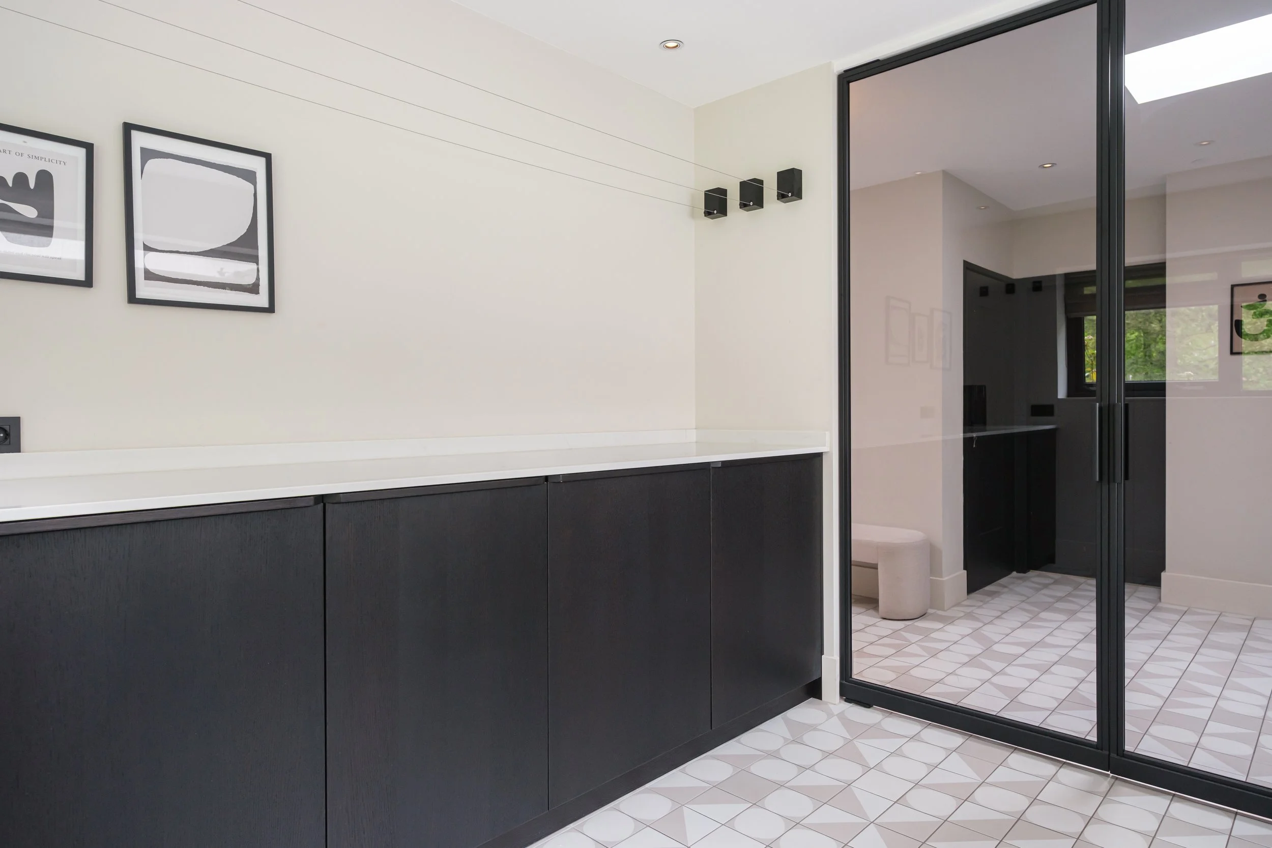 Op de plek van de oude keuken is nu een moderne, functionele wasruimte ingericht. Met elegante taatsdeuren kan de ruimte worden afgesloten, zodat het geluid van de wasmachine niet storend is in de rest van het huis.